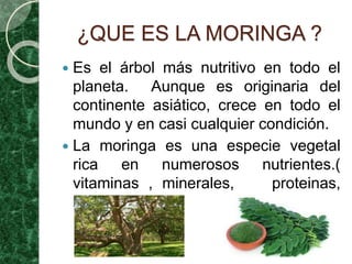 Este documento describe la moringa, un árbol muy nutritivo originario de Asia. Explica que todas las partes de la moringa, incluidas las hojas, flores, semillas y aceite, son ricas en nutrientes y tienen varios usos medicinales y alimenticios. También detalla algunos posibles efectos secundarios como problemas gastrointestinales, insomnio, hipoglucemia e interacciones con medicamentos anticoagulantes.
