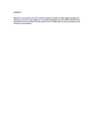 Morodo es un artista de ragga español nacido en Madrid en 1979 que adoptó un estilo singular con influencias de hip hop y reggae. Originalmente perteneció a la crew OZM del barrio de Alameda de Osuna en Madrid, donde produjo el álbum OZMLStayl que lo hizo conocido a nivel regional.