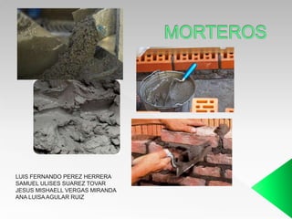 El documento describe los diferentes tipos de morteros, sus usos y propiedades. Explica que los morteros son mezclas plásticas compuestas principalmente de arena, agua y un aglutinante como cemento o cal. Se usan comúnmente para mampostería, aplanados y unión de piezas. Algunos tipos comunes son de cemento, cal, o mezclas de ambos, y varían en resistencia, plasticidad y adherencia.