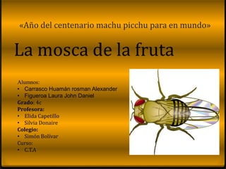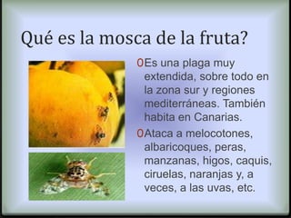 La mosca de la fruta es una plaga que afecta diversos cultivos de frutas en el Perú. Llegó por primera vez al país en 1956 en Huánuco a través de frutos silvestres provenientes de Brasil. También se detectó en Ica en 1956, causando daños económicos severos en la agricultura de esa región. Originaria de zonas templadas y tropicales de ambos hemisferios, la mosca de la fruta se ha distribuido a lo largo de todo el Perú y su ciclo de vida depende de la temperatura local.