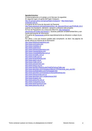 Este documento presenta una introducción general a la pesca con mosca, incluyendo preguntas frecuentes sobre el equipo, líneas, moscas, lanzamiento y técnicas básicas. También incluye secciones sobre las especies de peces encontradas en la Patagonia, tipos de moscas, y consejos para principiantes sobre cómo comenzar a pescar con mosca.