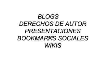 Este documento habla brevemente sobre las características de los blogs, sistemas de blogs populares como Blogger, Typepad y LiveJournal, cómo sitios como Technorati permiten encontrar la información más popular en la blogósfera, y también explica que las licencias Creative Commons permiten a los autores definir cómo otras personas pueden usar y compartir su trabajo protegido por derechos de autor.