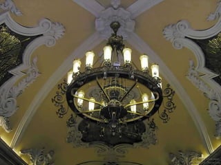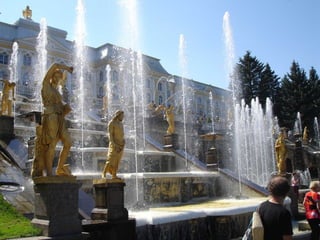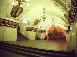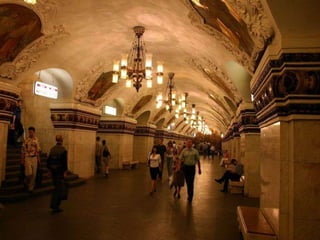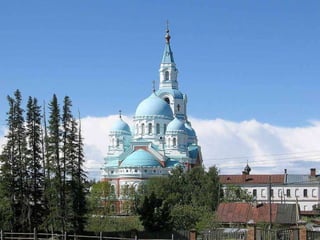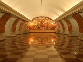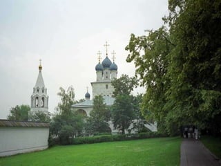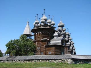 El documento describe varios lugares históricos y culturales importantes en Rusia, incluyendo el Metro de Moscú, conocido como el "palacio subterráneo"; el Palacio de Peterhof y sus jardines barrocos; la Catedral de Nuestra Señora de Kazan en Moscú; y el pueblo de madera de Kizhi en el lago Onega, declarado patrimonio de la humanidad. También menciona Kolómenskoe, antigua residencia de los zares a orillas del río Moscova, y el Monasterio de Valaam,