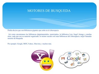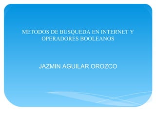 Este documento describe los diferentes métodos de búsqueda en Internet, incluyendo motores de búsqueda, índices temáticos y metabuscadores. Explica los operadores booleanos, de posición y relacionales que permiten enfocar las búsquedas vinculando términos. Los operadores booleanos incluyen AND, NOT y OR; los operadores de posición incluyen SAME, WITH y NEAR; y los operadores relacionales incluyen <, >, =, <>, <= y >=.
