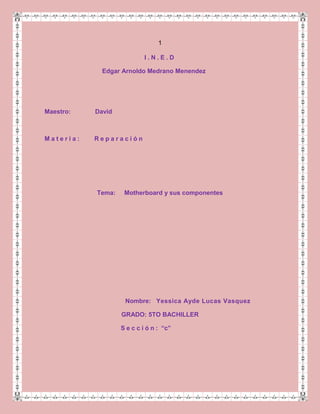Este documento describe los componentes principales de una tarjeta madre, incluyendo el procesador, memoria RAM, ranuras de expansión, chipset y otros. Explica los tipos comunes de tarjetas madres como ATX y AT, e identifica componentes como el BIOS, buses y conectores. También proporciona instrucciones para limpiar una tarjeta madre retirando el polvo de ventiladores, ranuras y otros componentes.