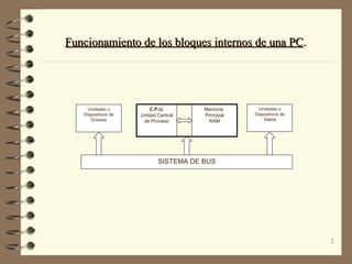 La CPU o unidad central de proceso es el componente principal de una computadora y se encarga de ejecutar las instrucciones de los programas. La placa madre contiene la CPU y es la base donde se conectan los demás componentes como la memoria RAM, las tarjetas de expansión y las unidades de entrada y salida. La placa madre también incluye chips importantes como el chipset y la BIOS.