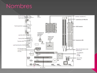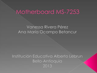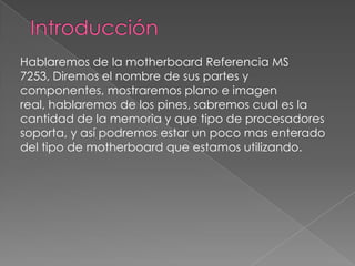 Este documento describe la motherboard MS7253, incluyendo sus partes y componentes principales como los conectores de alimentación ATX de 24 pines y CPU de 4 pines, los conectores IDE y SATA para discos duros, y los conectores para ventiladores y el panel frontal. También muestra una foto y diagrama de la placa base y explica qué tipo de procesadores y memoria soporta.
