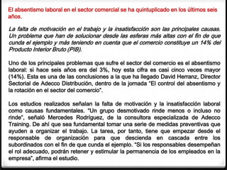 El absentismo laboral en el sector comercial se ha quintuplicado en los últimos seis años debido principalmente a la falta de motivación y insatisfacción laboral de los empleados. Esto ha afectado negativamente la productividad y el PIB del sector. Se necesitan medidas para mejorar la motivación de los trabajadores y prevenir el absentismo.