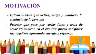 Este documento discute la motivación en el contexto educativo. Define la motivación como un estado interno que activa y dirige la conducta de una persona. Explica que la motivación intrínseca proviene del interior de la persona y la lleva a aprender por el placer de conocer, mientras que la motivación extrínseca depende de estímulos externos como premios o castigos. Finalmente, destaca que una buena motivación trae beneficios como el compromiso y el mejor rendimiento de los estudiantes, mientras que una mala motivación genera insegur