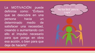 Este documento define la motivación como el impulso que dirige a una persona hacia una acción para satisfacer una necesidad. Explica que la motivación puede provenir de factores intrínsecos como la autonomía y la maestría, o de factores extrínsecos como el dinero y los beneficios. También describe la desmotivación como la pérdida de entusiasmo y energía ante obstáculos, y señala que aunque sea normal, tiene consecuencias que deben prevenirse.