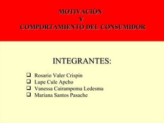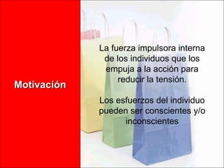 El documento aborda la motivación y el comportamiento del consumidor, definiendo motivación como la fuerza que impulsa a los individuos a reducir la tensión derivada de necesidades insatisfechas. Se discuten diferentes tipos de necesidades, conflictos motivacionales y cómo estas influyen en la toma de decisiones de compra, así como la importancia de la investigación motivacional para entender las emociones y actitudes subyacentes del consumidor. Además, se exploran diversas clasificaciones de comportamientos de compra, incluyendo impulsivos, habituales y de resolución de problemas.