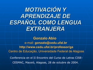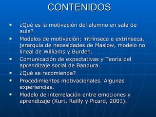 El documento explora la motivación en el aprendizaje del español como lengua extranjera, destacando la importancia de factores intrínsecos y extrínsecos, así como modelos teóricos de motivación. Se presentan estrategias para fomentar la motivación en el aula, tales como la creación de un ambiente positivo y el uso de materiales auténticos. Además, se enfatiza el papel crucial del profesor en motivar a los estudiantes a través de expectativas positivas y una dinámica de enseñanza adecuada.