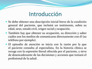 El documento describe los pasos para realizar una entrevista psicológica inicial con un paciente. Se enfatiza la importancia de obtener información sobre el motivo de consulta, una descripción del padecimiento actual del paciente y su actitud hacia este. También se discuten temas como establecer una relación de confianza con el paciente y conducir la entrevista de manera flexible y empática.