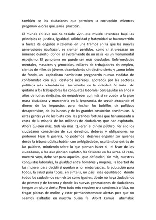 El documento reflexiona sobre los motivos de la violencia y falta de reflexión en la sociedad actual. Señala que vivimos en un mundo de cambios rápidos dominado por la ignorancia, y que las personas son adictas a las drogas, el alcohol, el sexo, la televisión y los juegos en línea. Esto ocurre porque la cultura oficial prefiere ocultar los problemas en lugar de abordarlos críticamente, y el capitalismo solo busca beneficiar a los bancos y corporaciones a costa del empobrecimiento de las personas. Se necesita conciencia