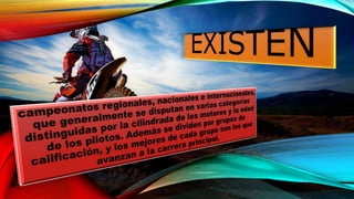 El motocross es una modalidad de motociclismo que se desarrolla en circuitos sin pavimentar, donde los participantes compiten en carreras para ser el primero en cruzar la meta. Se necesita control y destreza para manejar la motocicleta a alta velocidad sobre un terreno irregular con saltos, curvas cerradas y cambios bruscos, trabajando todos los músculos del cuerpo.