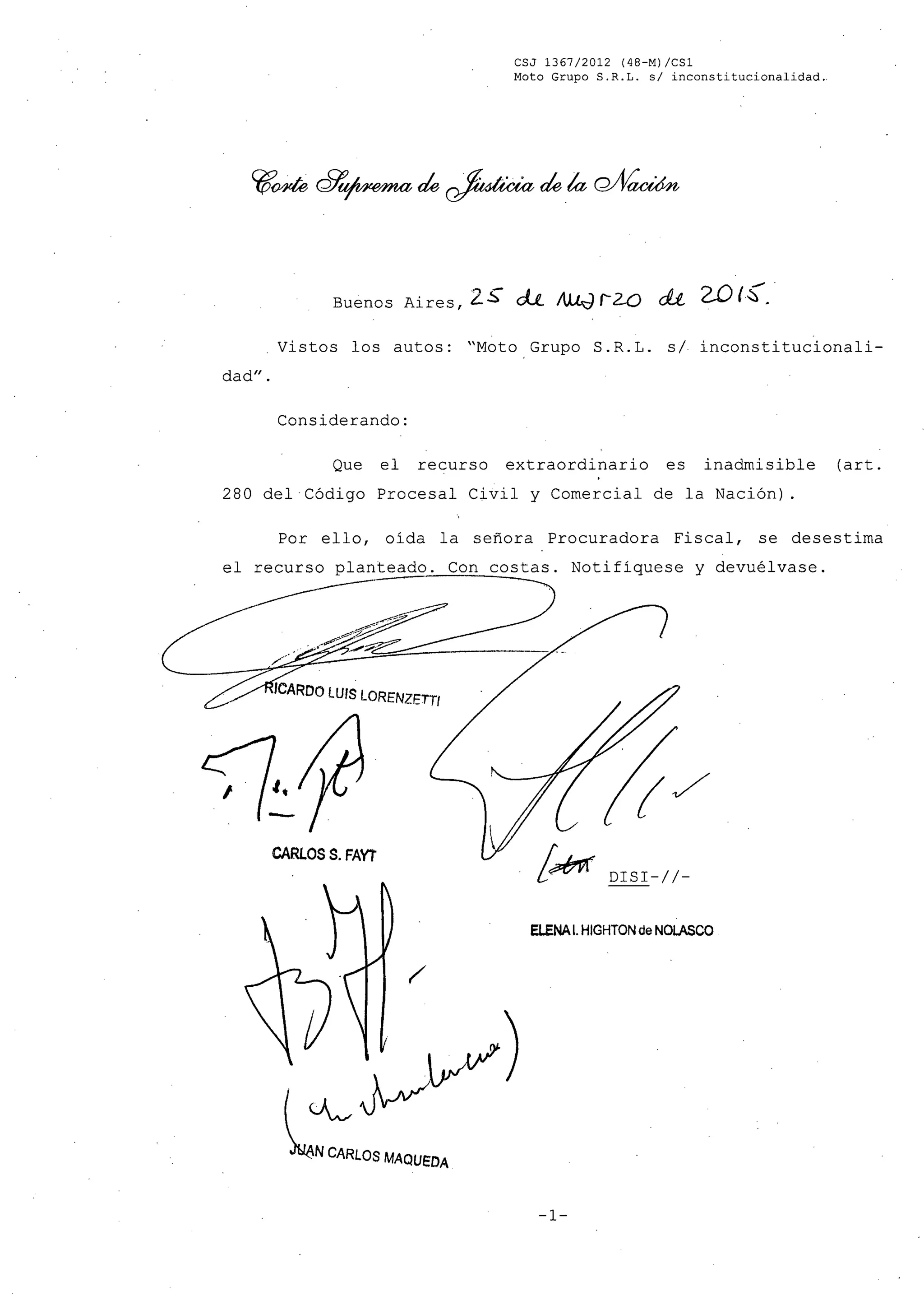 El documento presenta el fallo de la Corte Suprema de Justicia de Argentina en el caso "Moto Grupo S.R.L. s/ inconstitucionalidad". La Corte Suprema revoca la sentencia del Tribunal Superior de Justicia de La Rioja que había declarado inconstitucional la ordenanza municipal que establecía el cálculo de la base imponible de una tasa sobre los ingresos brutos de los contribuyentes. La Corte Suprema sostiene que tomar los ingresos brutos para calcular el monto de una tasa es admisible y no implica cambiar su n