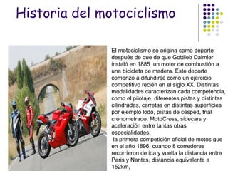 El motociclismo se originó como deporte en 1885 cuando Gottlieb Daimler instaló un motor de combustión a una bicicleta de madera. Se desarrolló como deporte competitivo en el siglo XX con diferentes modalidades como motocross, velocidad, enduro y trial. El motociclismo incluye varios tipos de motos como ciclomotores, sidecars, scooters, deportivas, de cross, trail, todoterreno, racing, turismo, touring, sport, naked y choppers.