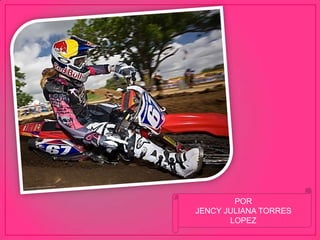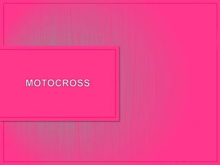 El motocross es un deporte motorizado que se practica en circuitos sin pavimentar con saltos grandes. Requiere controlar la motocicleta a alta velocidad sobre terrenos irregulares con curvas cerradas, montículos y baches, lo que genera saltos y derrapes constantes. Es una disciplina físicamente exigente que permite realizar acrobacias aéreas de manera libre.