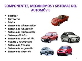 El documento describe los principales componentes y sistemas de un automóvil, incluyendo el bastidor, motor, sistema de transmisión, frenos, suspensión y dirección. Explica que un automóvil es un vehículo que puede moverse de manera autónoma gracias a sus sistemas mecánicos, eléctricos, neumáticos e hidráulicos. También cubre brevemente la evolución del automóvil y los conceptos básicos de mantenimiento vehicular.