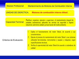 Este documento proporciona información sobre los motores diésel, incluyendo su historia, definición, sistemas auxiliares, características, principio de funcionamiento y ciclos teóricos. Explica que Rudolf Diesel inventó el motor diésel en 1892 y cómo funciona mediante la ignición del combustible al ser inyectado en una cámara de combustión que contiene aire a alta presión y temperatura.