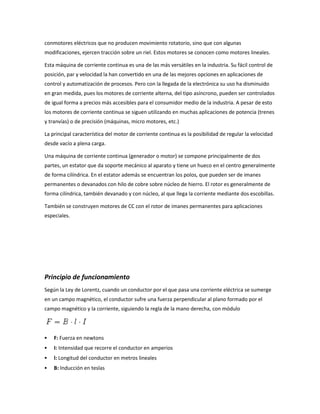 El documento describe los diferentes tipos de motores eléctricos, incluyendo sus principios de funcionamiento y características. Explica que los motores eléctricos transforman energía eléctrica en energía mecánica a través de interacciones electromagnéticas, y que algunos también pueden funcionar como generadores transformando energía mecánica en eléctrica. Además, resume los principales tipos de motores como motores de corriente continua, motores de corriente alterna, motores serie, shunt, compound y motores sin escob