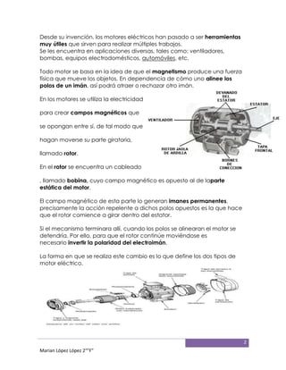 El motor eléctrico transforma la energía eléctrica en energía mecánica mediante la repulsión de un objeto metálico cargado eléctricamente ante un imán permanente. Algunos motores eléctricos también pueden funcionar como generadores para transformar energía mecánica en eléctrica. Los motores eléctricos se utilizan ampliamente en aplicaciones industriales, comerciales y domésticas como ventiladores, bombas, electrodomésticos y herramientas.