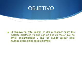 Este documento describe los tipos y aplicaciones de los motores eléctricos. Explica que hay tres tipos principales de motores eléctricos - de corriente continua, corriente alterna y universal - y cómo funcionan. También detalla los ahorros energéticos y ambientales que proporcionan los motores eléctricos, así como sus usos comunes en la industria y la vida cotidiana.