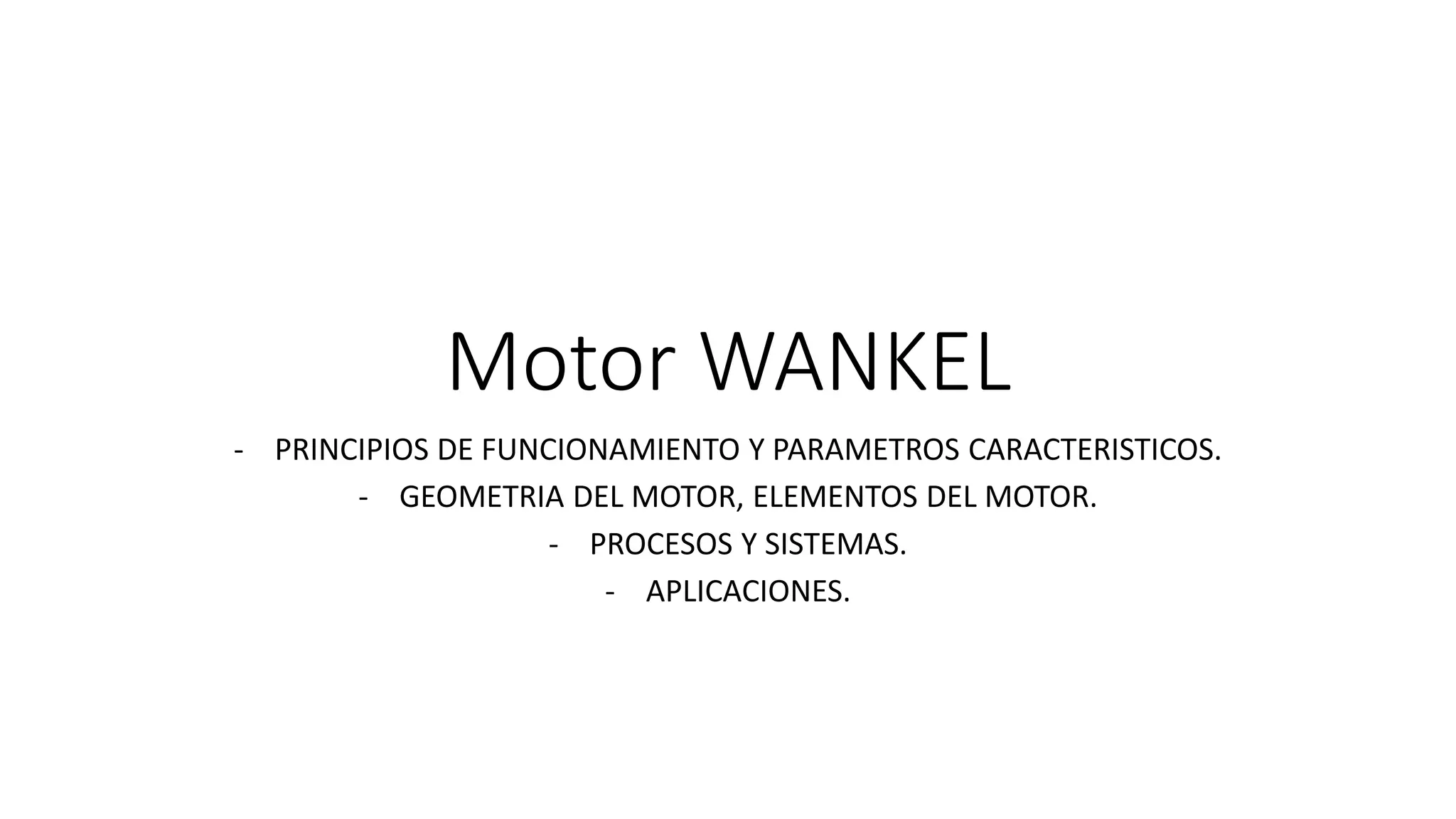 Este documento describe el motor Wankel, un motor rotativo de cuatro tiempos. Explica que funciona con un rotor triangular girando dentro de una cavidad en forma de 8 (epitrocoide), delimitando tres cámaras que alternativamente admiten aire, se comprimen, explotan y expulsan gases. Detalla los componentes del motor como el epitrocoide, lumbreras, bujías y patines, y los procesos de admisión, compresión, explosión y escape. Finalmente, indica que este motor se ha aplicado en automóviles y otras máquinas.