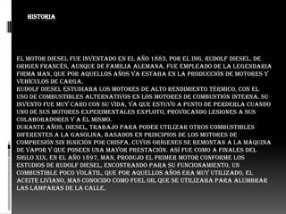 El documento describe la historia, funcionamiento y ventajas y desventajas del motor diésel. Rudolf Diesel inventó el motor diésel en 1883 buscando un motor de alto rendimiento térmico que utilizara combustibles alternativos. Un motor diésel funciona mediante la autoinflamación del combustible inyectado en el cilindro debido a la alta temperatura y presión alcanzadas durante la compresión. Las principales ventajas del motor diésel son su bajo consumo de combustible, aunque también presenta desventajas como un mayor precio inicial.