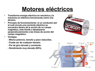 El documento describe los diferentes tipos de motores, incluyendo motores eléctricos, motores de explosión, motores diesel y el motor Wankel. Los motores eléctricos convierten energía eléctrica en mecánica y viceversa, mientras que los motores de explosión utilizan la explosión de combustible. Los motores diesel encienden el combustible mediante la compresión del aire, lo que los hace más eficientes que los motores de gasolina. El motor Wankel usa rotores en lugar de pistones para completar los cuatro tiempos del