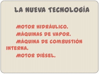 El documento habla sobre los diferentes tipos de motores, incluyendo motores de combustión interna, de vapor, eléctricos y otros, describiendo brevemente sus componentes, beneficios y perjuicios, así como nuevas tecnologías como el motor Diésel. Finalmente, agradece al lector por su atención.