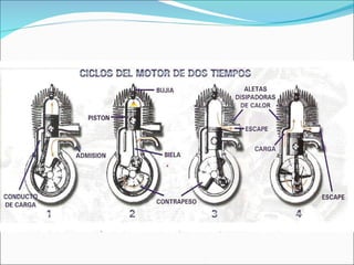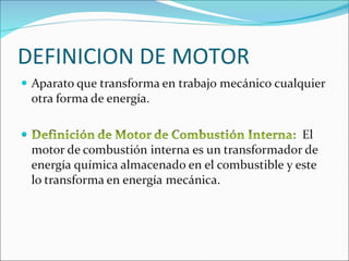 El documento describe los diferentes tipos de motores de combustión interna, incluyendo motores Otto, Diesel, de dos tiempos y Wankel. Explica las clasificaciones, ciclos de trabajo, sistemas y partes de cada motor. También destaca las diferencias entre motores Diesel y Otto, así como las características y ciclos de trabajo de los motores de dos tiempos y Wankel.