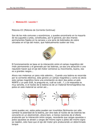 Este documento proporciona una introducción a los motores de corriente continua y motores paso a paso. Explica brevemente el funcionamiento de los motores de corriente continua y describe cómo el integrado L293B puede usarse para controlar el sentido de giro y la velocidad de estos motores. También incluye ejemplos de circuitos para controlar motores de corriente continua usando el L293B.