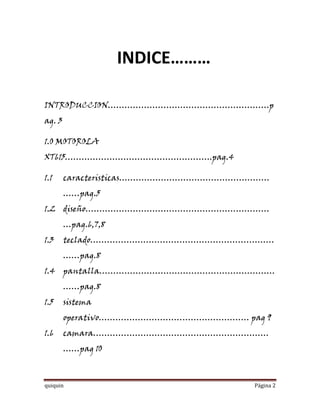 El Motorola XT615 es un smartphone con pantalla táctil de 4 pulgadas que funciona con Android 2.3.7 e incluye características como cámara de 8 megapíxeles, 2GB de memoria interna y ranura microSD para expansión. El documento describe las especificaciones, diseño, software, aplicaciones y otros detalles técnicos del teléfono.