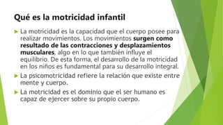 La motricidad se refiere a la capacidad del cuerpo para realizar movimientos y está dividida en motricidad fina y gruesa. La motricidad fina implica los músculos de las manos y dedos y es fundamental para interactuar con objetos, mientras que la motricidad gruesa implica los músculos grandes y permite movimientos como caminar, saltar y nadar. El desarrollo de la motricidad es clave en los primeros años de vida y las técnicas grafo-plásticas como dibujar y pintar ayud