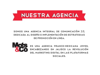 Presentación de MotsAndCo, agencia web franco-mexicana que ha hecho de las redes sociales su especialidad.Nos especializamos en la creación de estrategias digitales y formación en el uso de redes sociales.