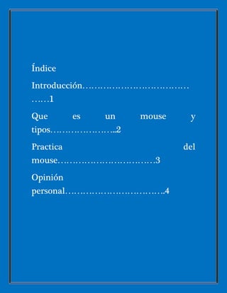 Este documento describe los diferentes tipos de mouse, incluyendo mouse mecánico, óptico y láser. Explica que el mouse es el principal dispositivo de entrada y se usa para el 90% de las acciones del usuario. Detalla los tipos de conectores como serial, PS/2 y USB. También resume una práctica de desarmar y volver a armar un mouse y dibujar sus componentes internos.