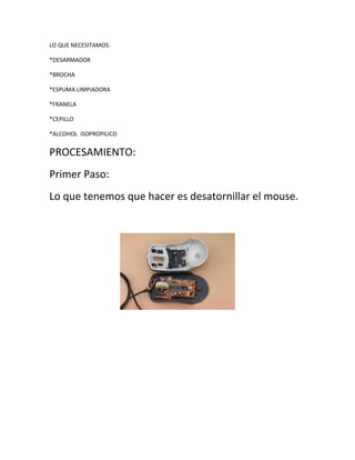 El documento proporciona instrucciones para limpiar un mouse, incluyendo los materiales necesarios (desarmador, brocha, espuma limpiadora, franela, cepillo, alcohol isopropílico) y los pasos a seguir: 1) desatornillar el mouse, 2) lavar las partes plásticas con espuma limpiadora, 3) limpiar la tarjeta de control con brocha, 4) aplicar limpiador de circuitos a la tarjeta, 5) limpiar el cable con espuma y franela, 6) volver a armar el mouse.