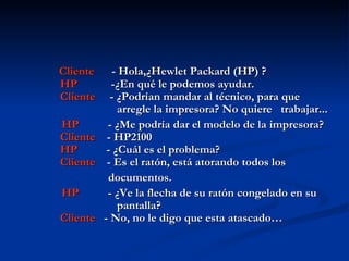 Un cliente llamó a soporte técnico de HP porque su impresora HP2100 no funcionaba correctamente. El cliente explicó que el "ratón" de la impresora se atascaba y no dejaba pasar los documentos, aunque el representante de HP intentó aclarar que las impresoras no tienen ratones. El cliente no pudo describir claramente el problema técnico que estaba experimentando.
