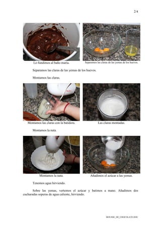 Este documento proporciona instrucciones para preparar una mousse de chocolate para 4 personas. Los ingredientes principales son 200g de chocolate al 60% de cacao o más, 3 huevos, 300ml de nata para montar y 50g de azúcar. Se derrite el chocolate y se separan las claras de las yemas de los huevos. Luego se bate la nata, las claras y las yemas por separado y se mezclan todos los ingredientes envolventemente para obtener una mousse suave que se enfría en la nevera antes de servir.