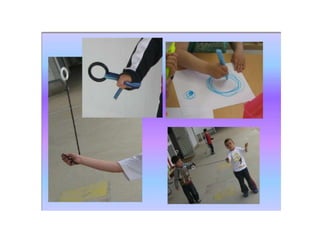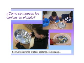 El documento describe diferentes formas de hacer que objetos se muevan en un movimiento circular, como mover canicas en un plato girándolo o soplándolo, o hacer rodar anillas enhebradas en cintas de diferentes longitudes alrededor de un listón de madera, resultando en recorridos circulares grandes o pequeños. El alumnado representa gráficamente estos movimientos curvilíneos.