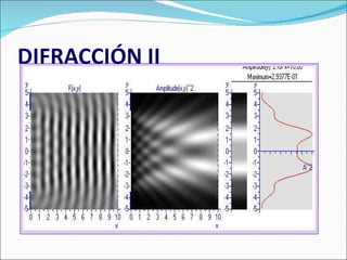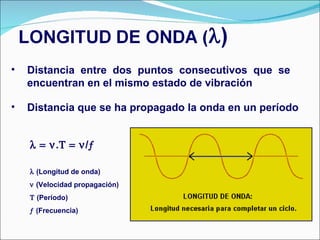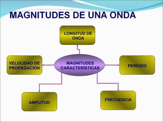 El documento describe las características fundamentales de las ondas, incluyendo longitud de onda, período, frecuencia, amplitud y velocidad de propagación. También explica fenómenos ondulatorios como la reflexión, refracción, difracción e interferencia. La velocidad de propagación de una onda depende de la elasticidad del medio y la inercia de sus partículas.