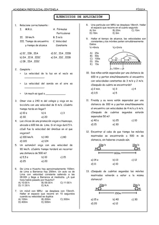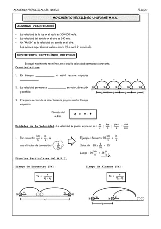 Este documento presenta información sobre conceptos básicos de física como velocidad, movimiento rectilíneo uniforme y sus fórmulas. Define la velocidad de la luz, el sonido y el Mach. Explica las características del movimiento rectilíneo uniforme y presenta ejercicios de aplicación sobre distintos problemas de velocidad y tiempo.