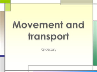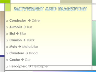 El documento proporciona una lista de vocabulario relacionado con el movimiento y el transporte, incluyendo diferentes modos de transporte como autobús, bicicleta, camión, moto, coche, helicóptero, taxi, tren, barco, avión; lugares como aeropuerto, puerto, estación de autobuses; verbos de movimiento como andar, correr, saltar, bailar, girar, nadar; y frases comunes relacionadas con la dirección y el transporte.