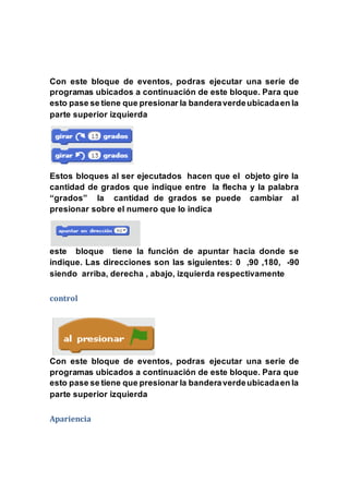 Este documento explica los bloques de movimiento, apariencia y control en Scratch. Describe cómo los objetos se mueven a través del escenario usando coordenadas x e y, y cómo rebotan en los lados. También explica cómo cambiar la dirección, velocidad y apariencia de los objetos, y cómo controlar el flujo del programa usando bucles y condiciones.
