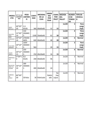 Este documento proporciona información sobre el transporte de diferentes productos en contenedores, incluyendo detalles sobre el peso, medidas y cantidad de cada producto. También describe los tipos de contenedores, sus características y tarifas de transporte terrestre para frutas y hortalizas en Colombia. Por último, incluye tarifas de fletes marítimos desde puertos en Hong Kong, China y Taiwán.