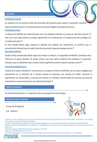 Movial es un complemento alimenticio oral que estimula la producción de líquido sinovial en las articulaciones para mejorar la lubricación y movilidad. Estudios in vitro y en animales mostraron que Movial aumenta la síntesis de ácido hialurónico y mejora la inflamación y destrucción del cartílago. Estudios clínicos encontraron menor dolor y mejor calidad de vida en pacientes que tomaron Movial en comparación con un placebo.