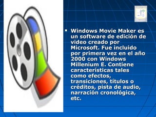 Windows Movie Maker es un software de edición de video creado por Microsoft que permite a los usuarios capturar y editar audio y video para crear películas. Incluye características como efectos, transiciones, títulos y banda sonora. Los usuarios pueden guardar y compartir sus películas terminadas.