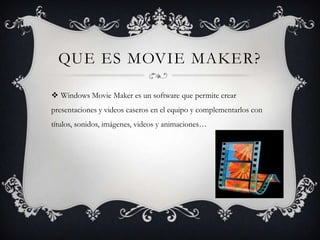 Windows Movie Maker es un software que permite crear presentaciones y videos caseros agregando títulos, sonido, imágenes, videos y animaciones. Ofrece opciones para editar el sonido, importar imágenes y videos, cortar clips, agregar créditos y compartir la película terminada. La escala de tiempo muestra la duración de cada clip para editar el proyecto.