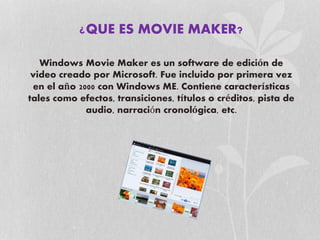 Windows Movie Maker es un software de edición de video creado por Microsoft que permite agregar videos, imágenes, sonido, títulos, créditos y efectos a películas. El documento explica cómo insertar estos diferentes elementos en Movie Maker y define conceptos clave como escala de tiempo, galería, transiciones y efectos.